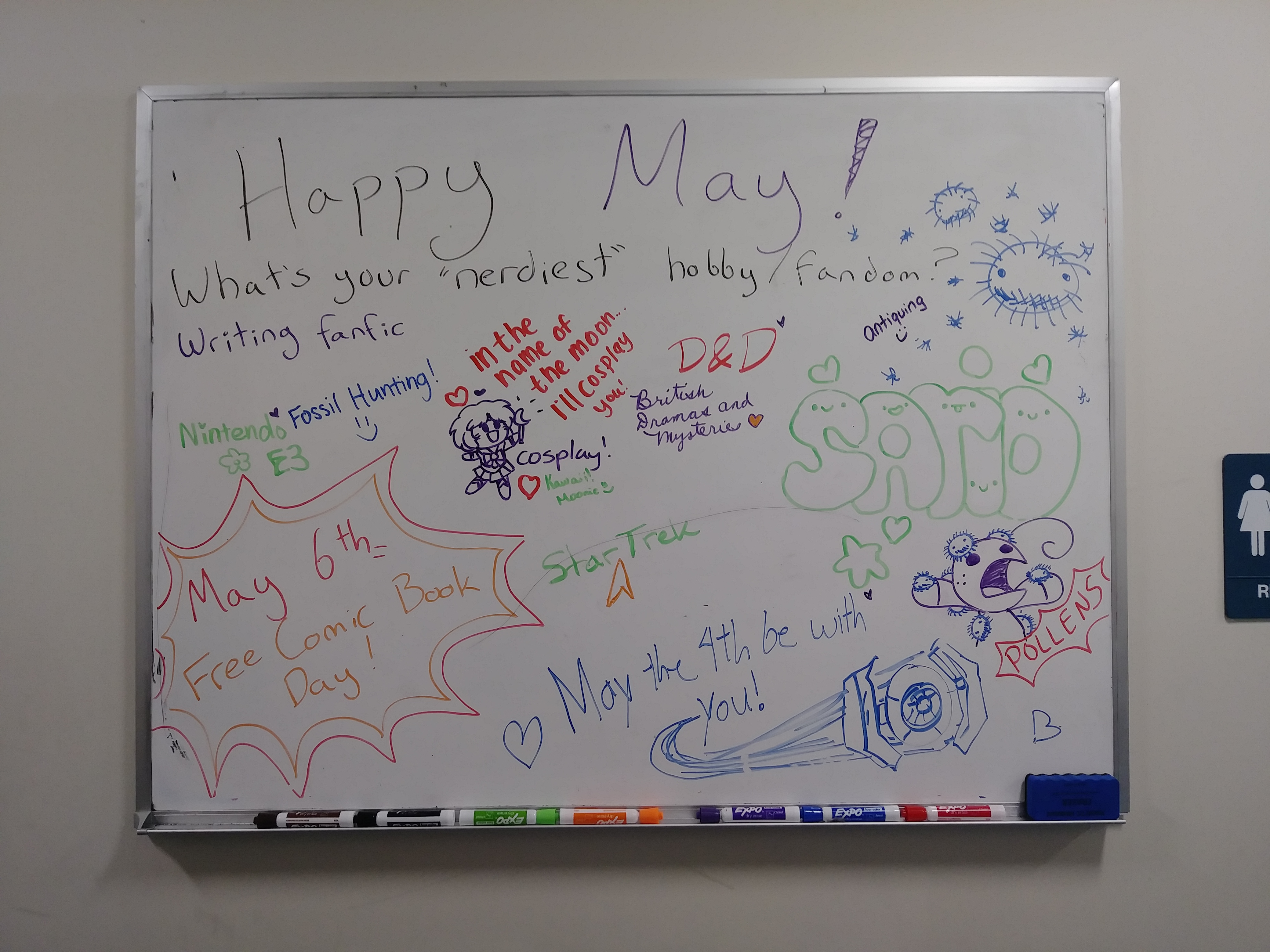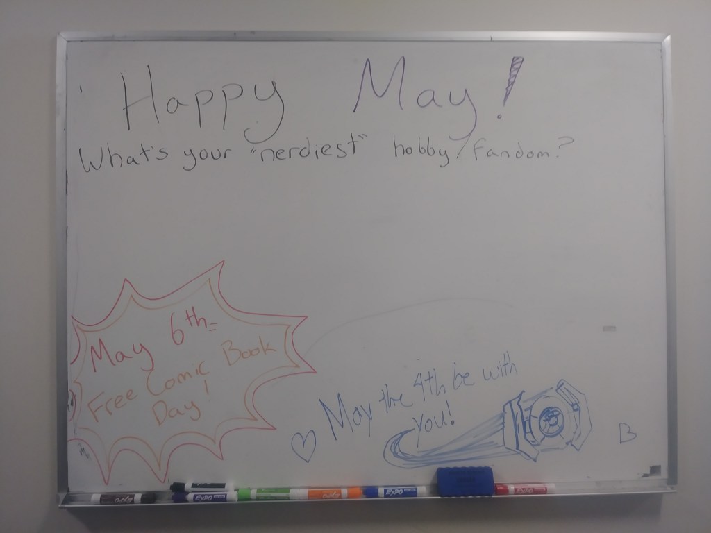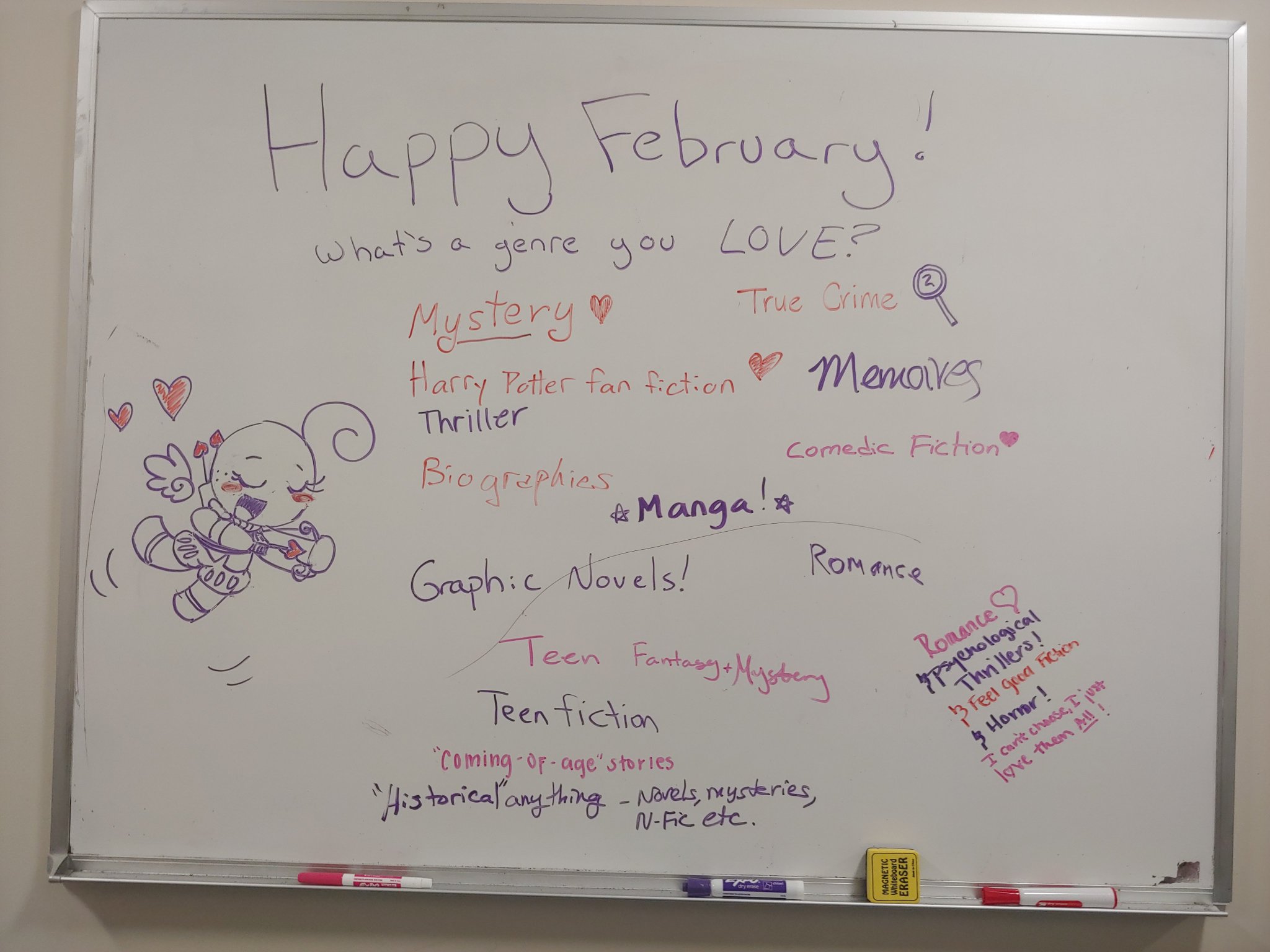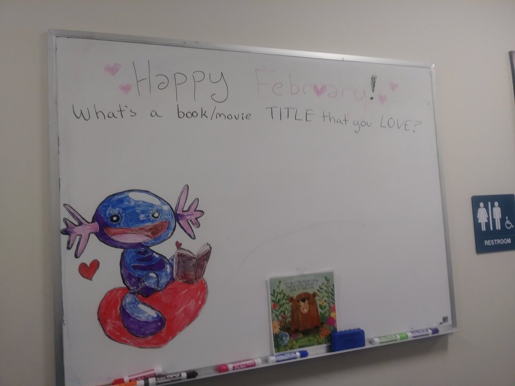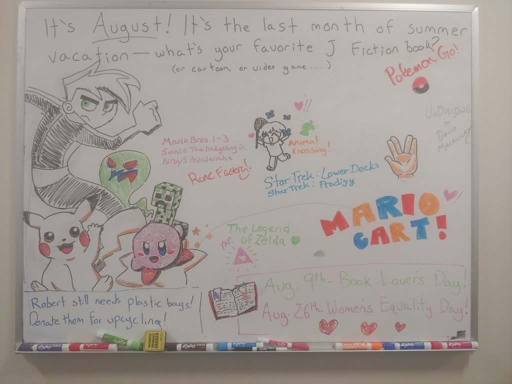 Every month, I update our library’s whiteboard with a new doodle and a discussion question. Here’s the archive of all previous doodles/discussions, with pics taken at the beginning and end of the month!