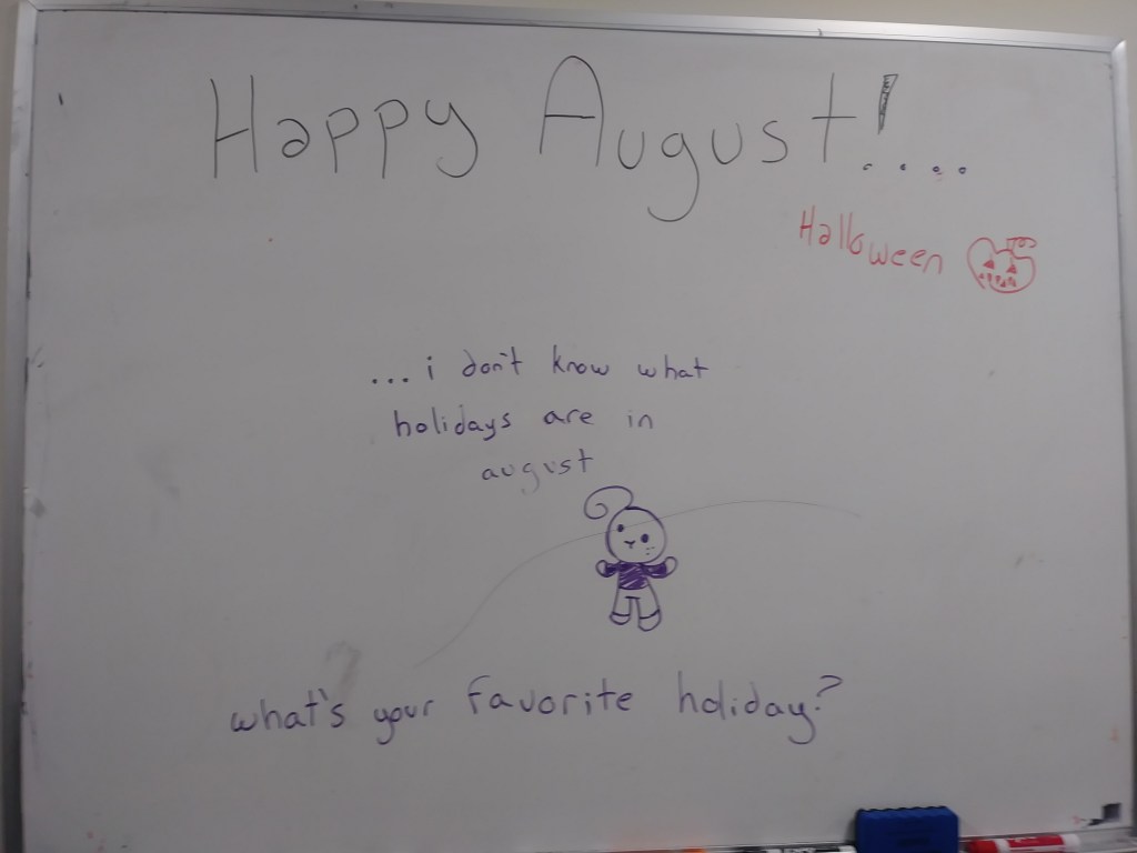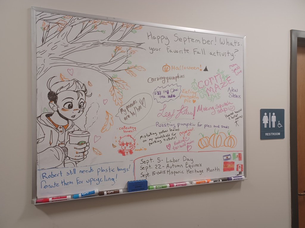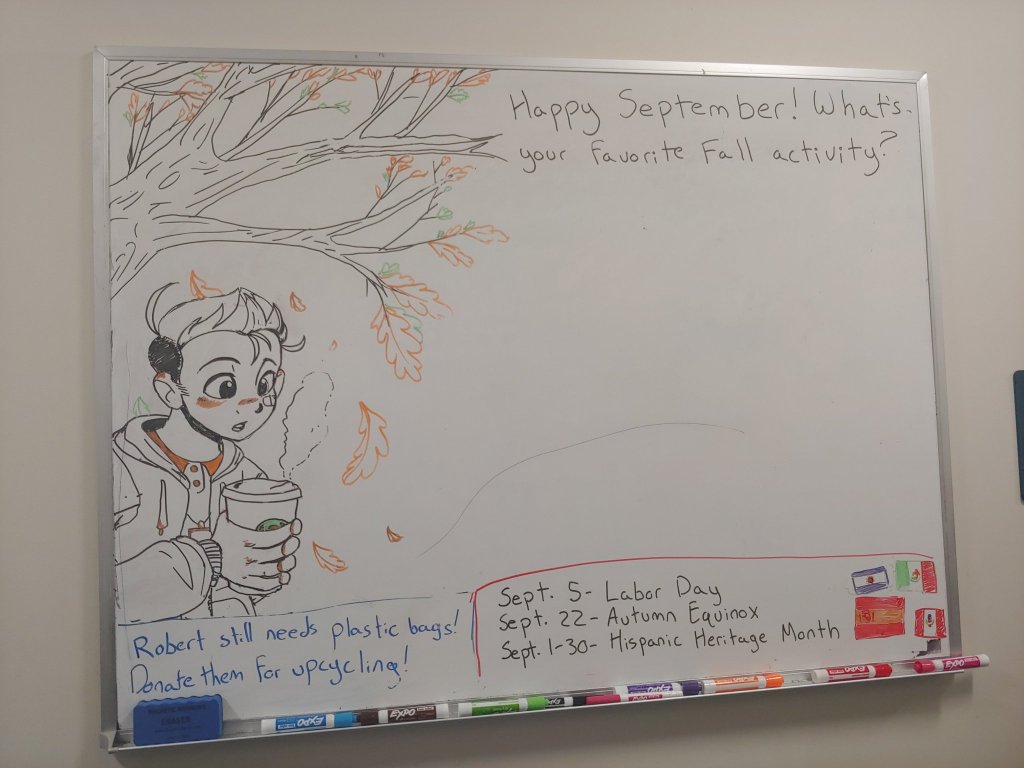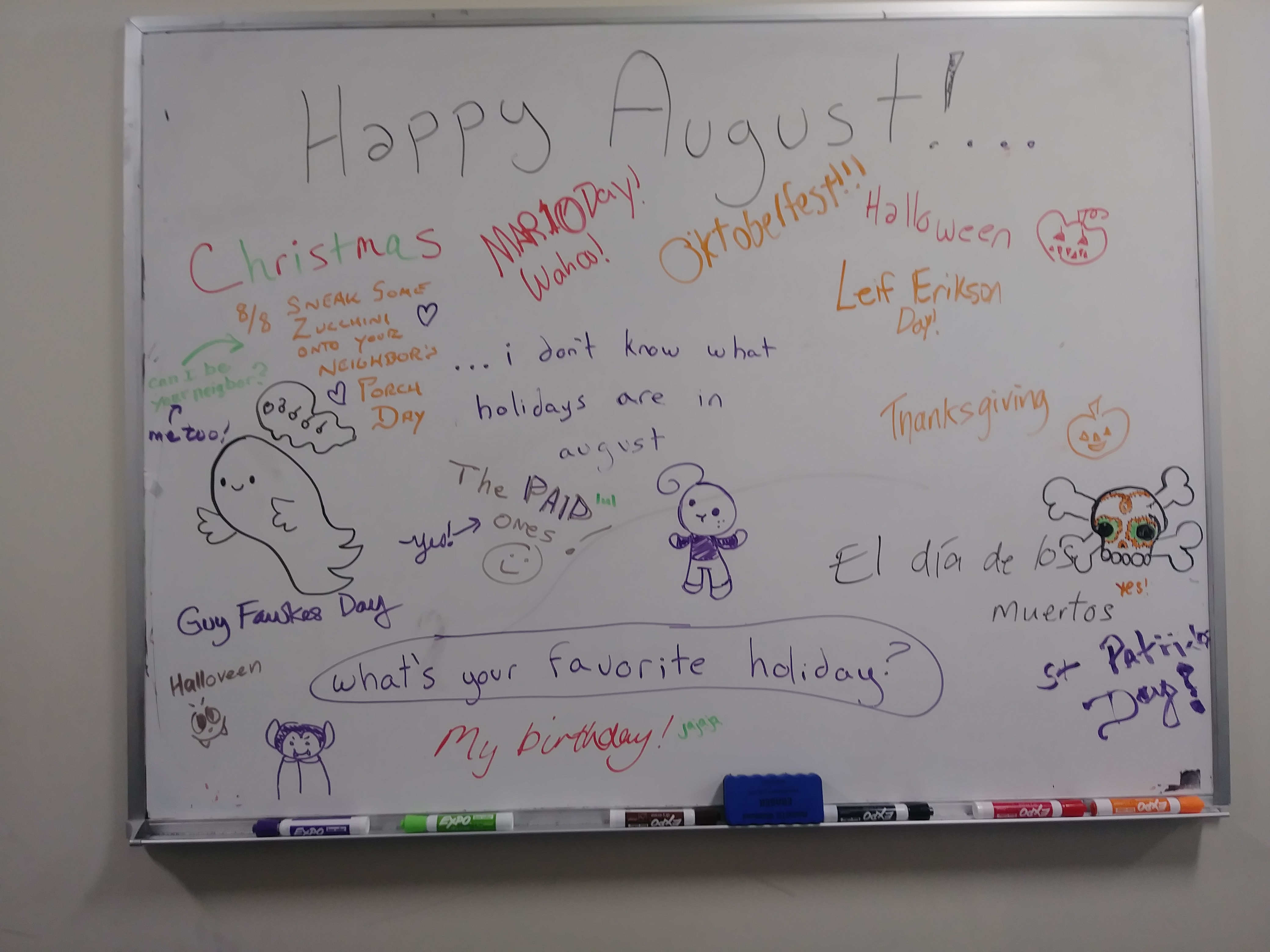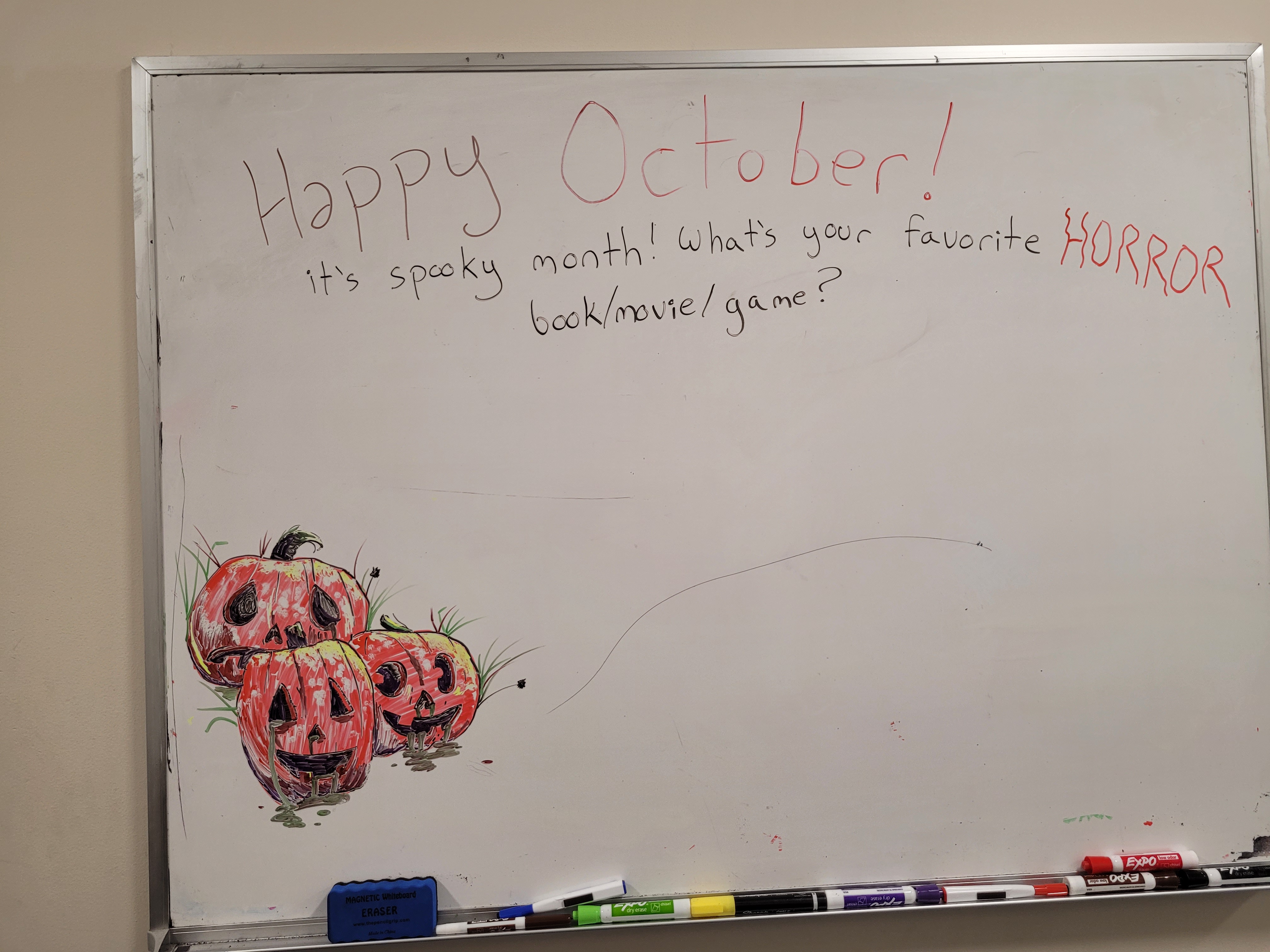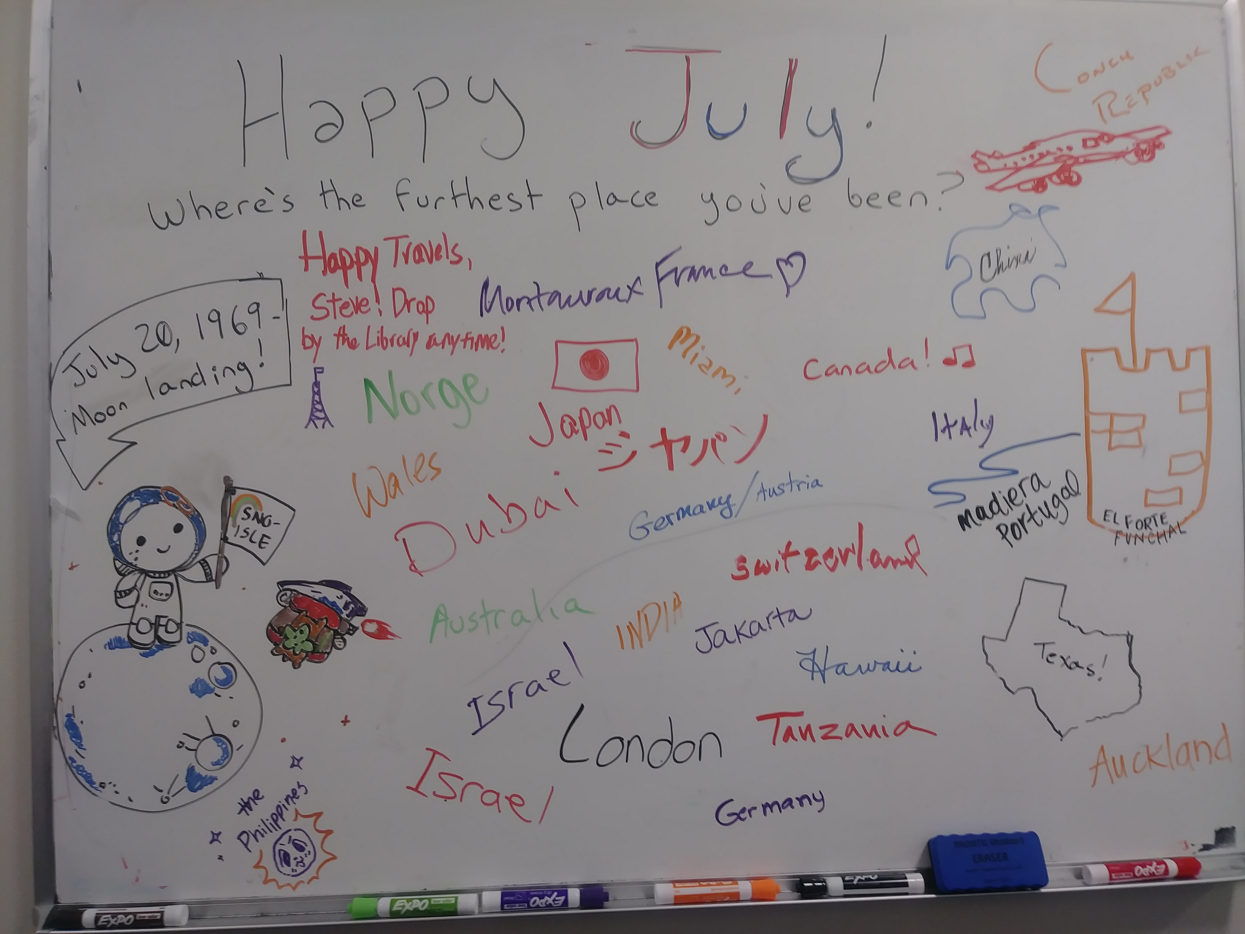 Every month, I update our library’s whiteboard with a new doodle and a discussion question. Here’s the archive of all previous doodles/discussions, with pics taken at the beginning and end of the month!