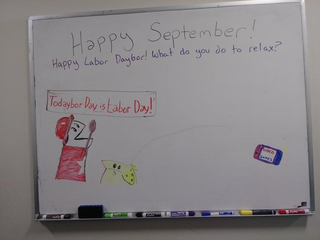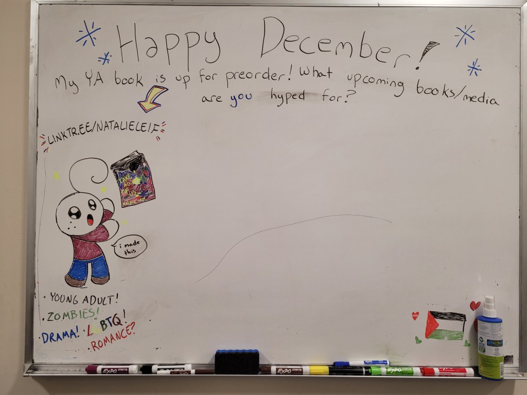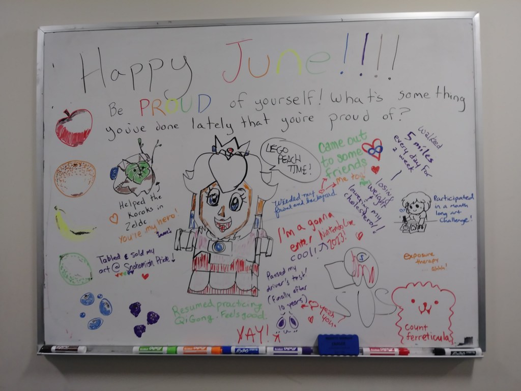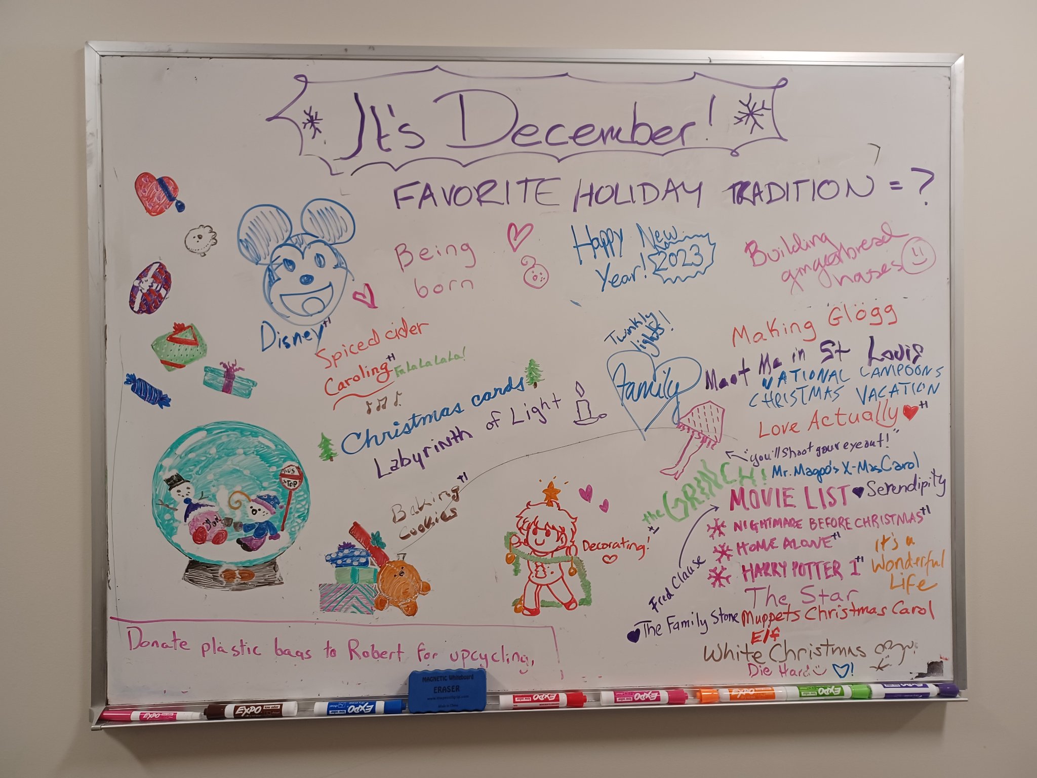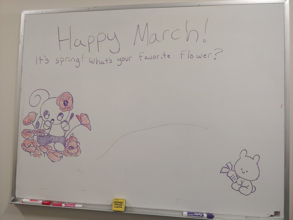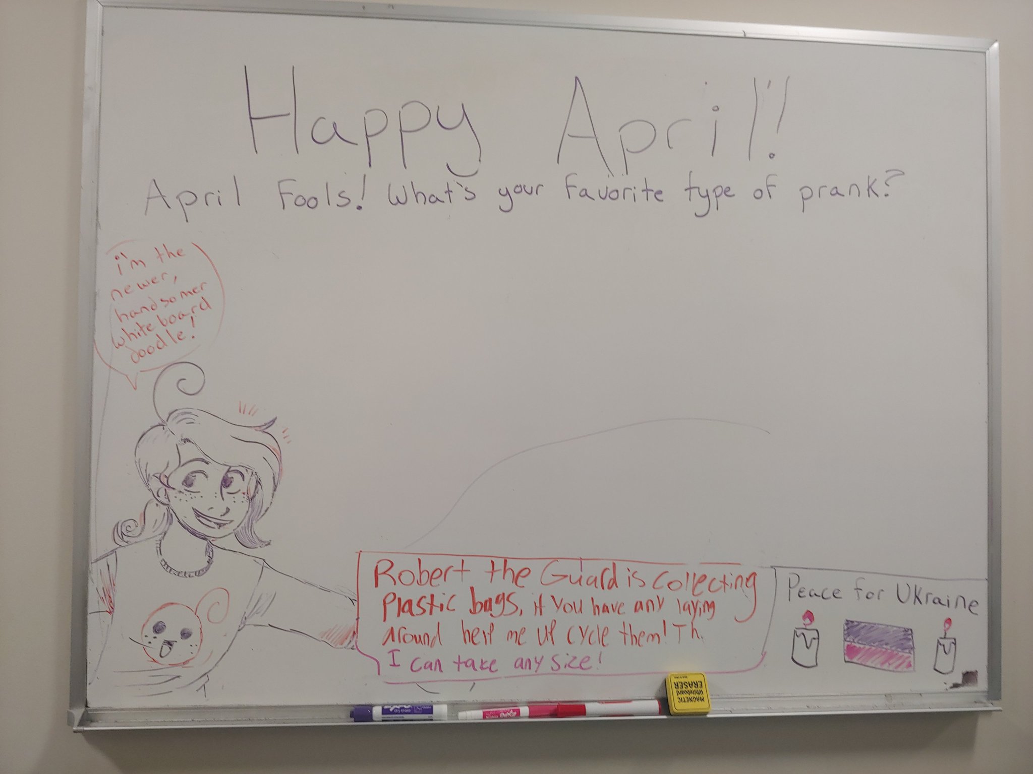 Every month, I update our library’s whiteboard with a new doodle and a discussion question. Here’s the archive of all previous doodles/discussions, with pics taken at the beginning and end of the month!