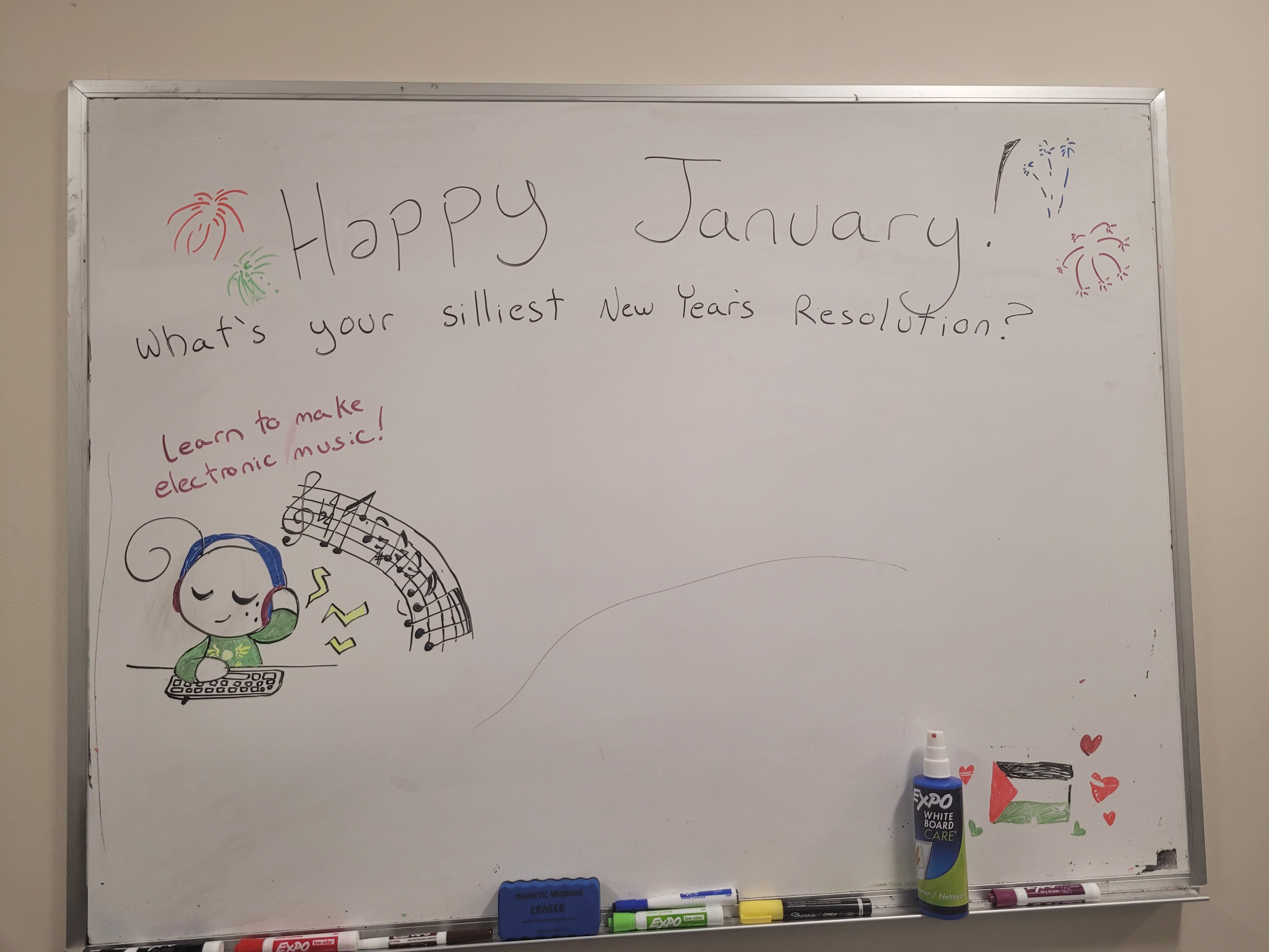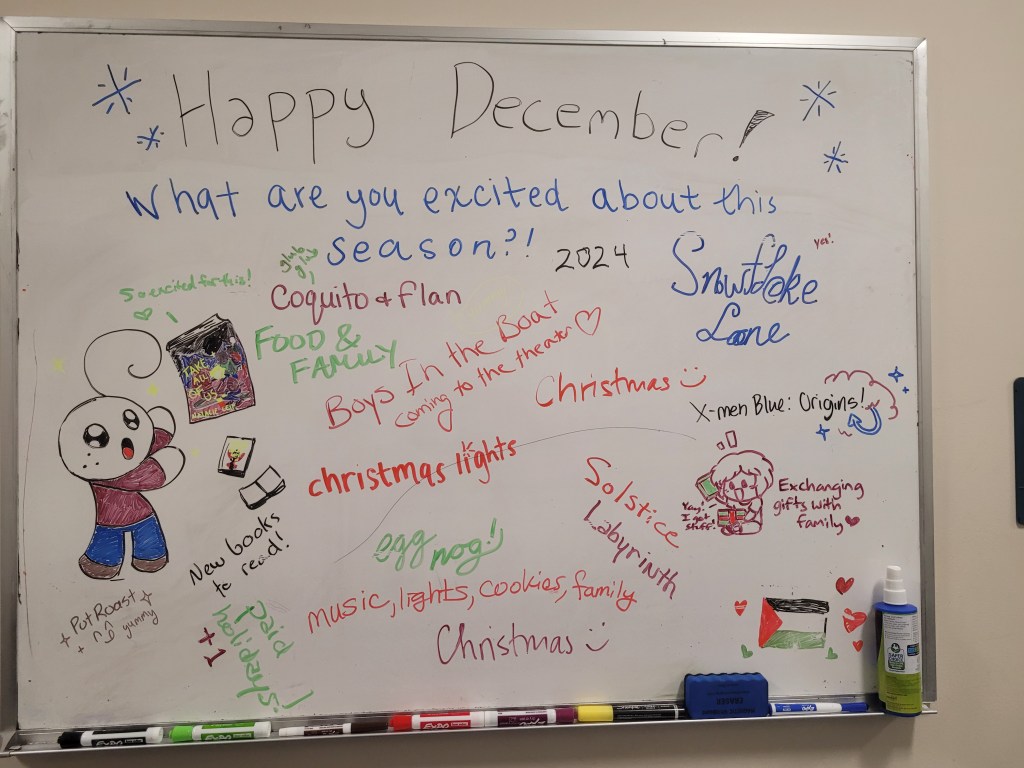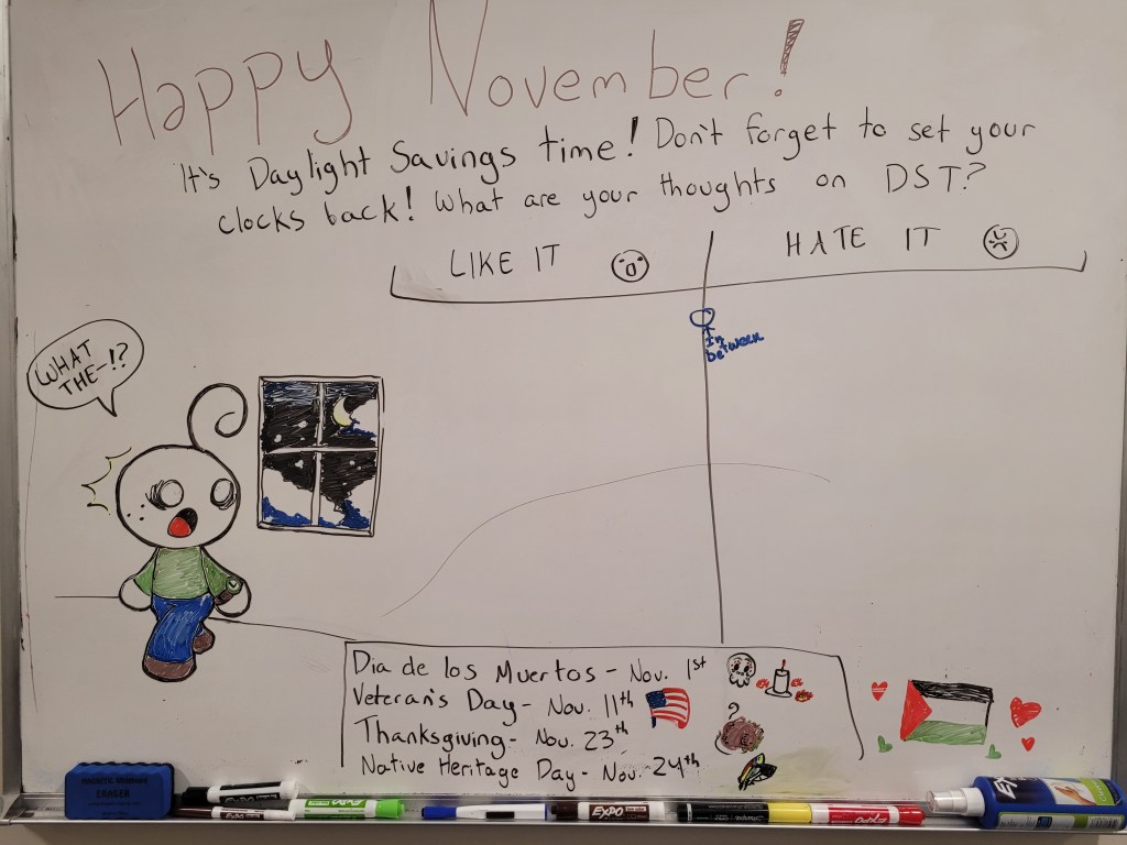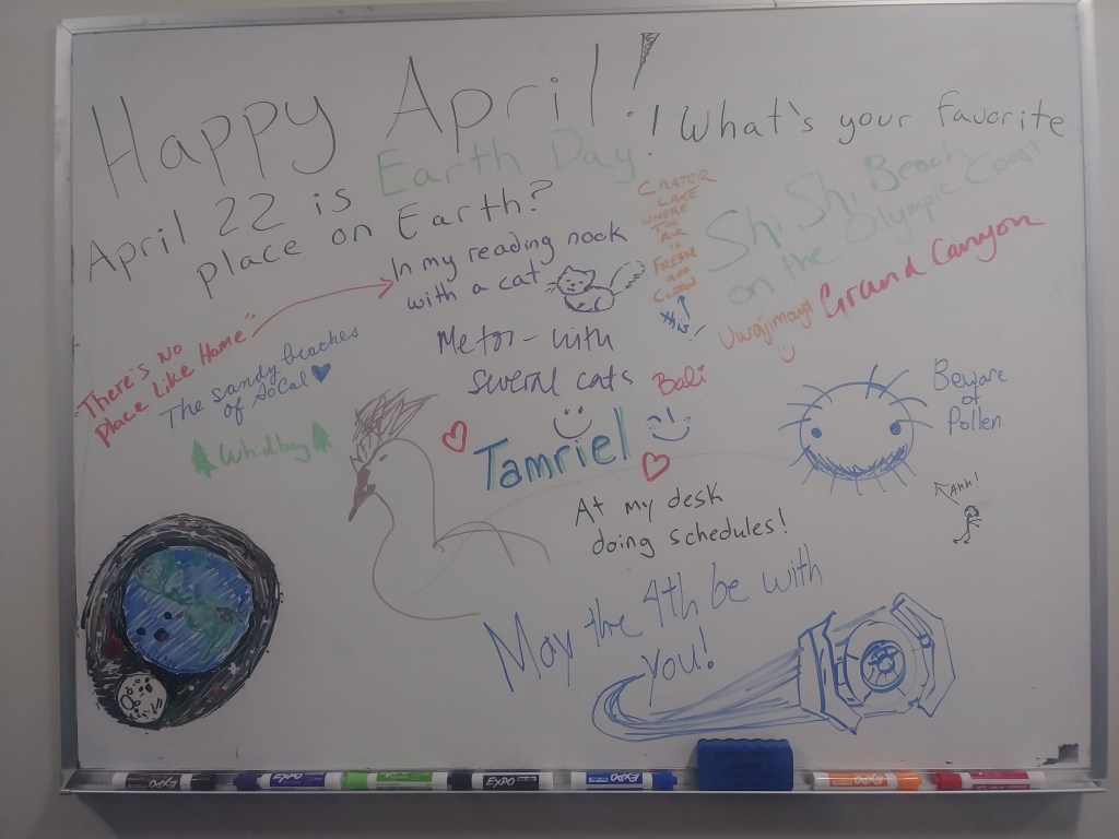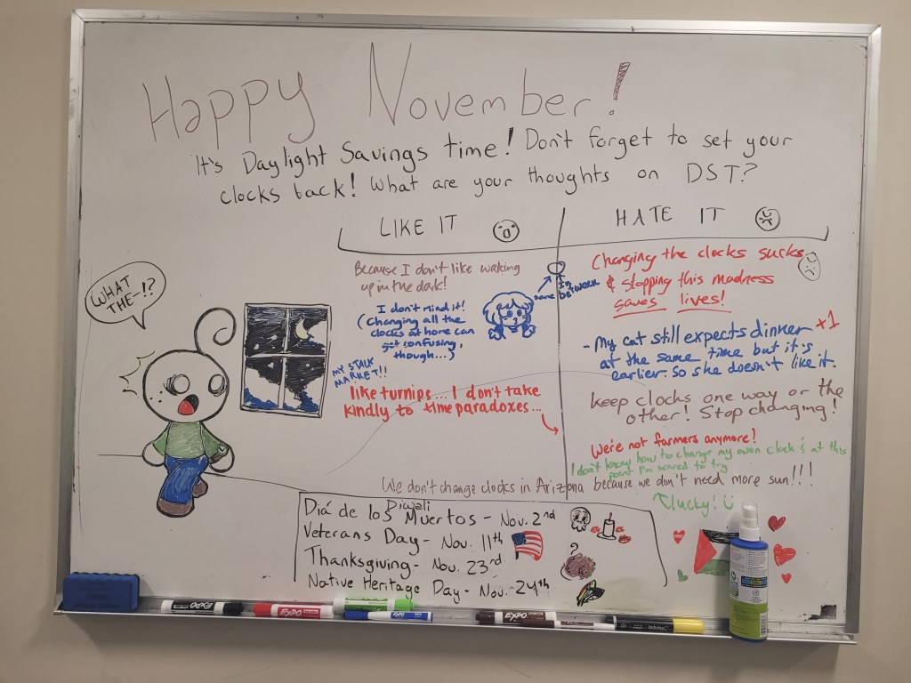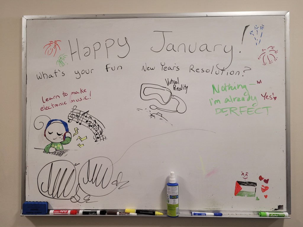 Every month, I update our library’s whiteboard with a new doodle and a discussion question. Here’s the archive of all previous doodles/discussions, with pics taken at the beginning and end of the month!